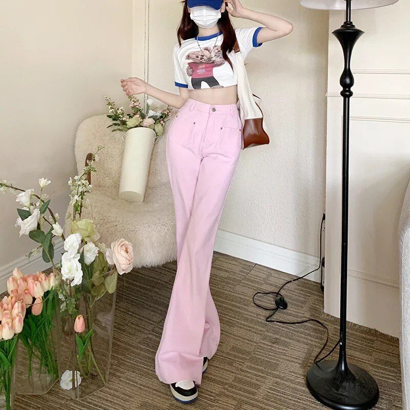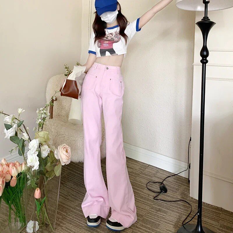 Chic Pink Flare Denim Jeans – Vintage Baggy Y2K Aesthetic – Full Length Women’s Trousers