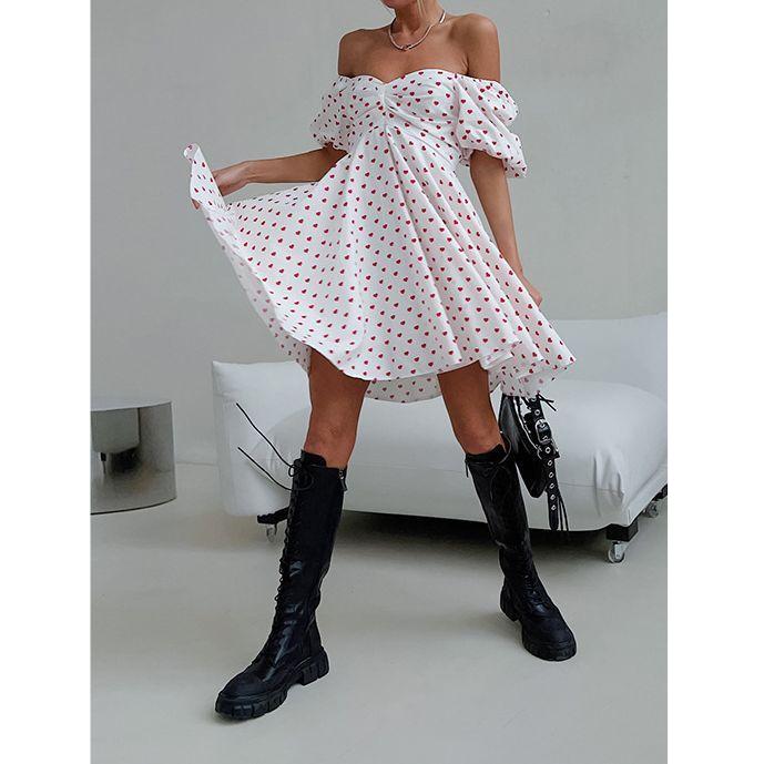 Step into the sunshine with confidence and charm in our Elegant Puff Sleeve Summer Dress. Designed for the modern woman who loves to blend vintage aesthetics with contemporary style, this dress is a perfect fusion of elegance, comfort, and playful design. Its unique heart print and flattering slash neck silhouette make it a standout addition to your wardrobe, promising to turn heads wherever you go.