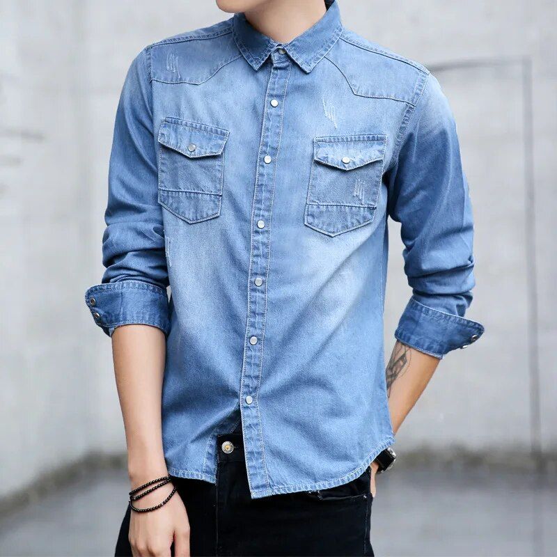 Korean Slim Fit Denim Shirt – Men’s Stylish Long Sleeve Casual Coat