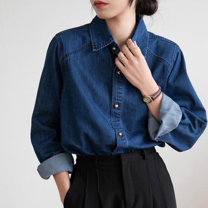 Chic Dark Blue Denim Shirt for Women – Spring Full Sleeve Loose Retro Jacket