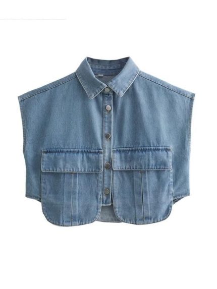 Chic Solid Color Sleeveless Denim Crop Shirt with Double Pocket